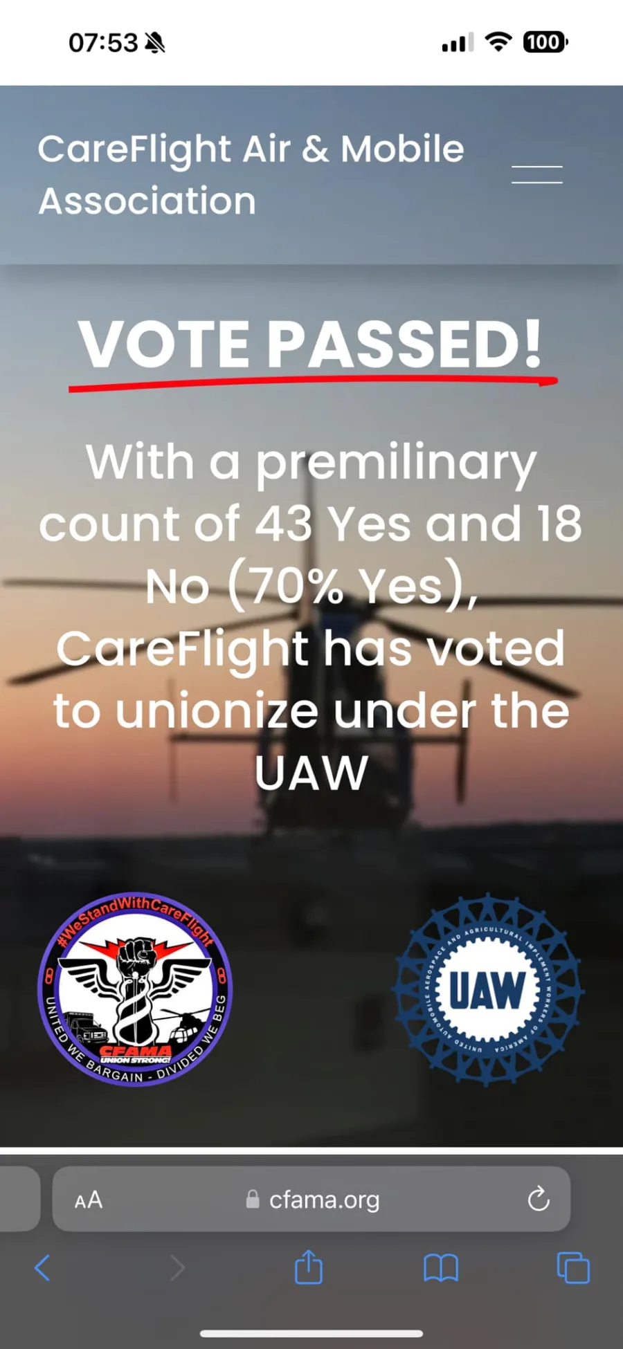 CareFlight Bargaining Updates CareFlight -Vote Passed Angela Wenger 23 Jan, 2025 Social share icons CareFlight Nurses and Paramedics voted to unionize under the UAW in June 2024.